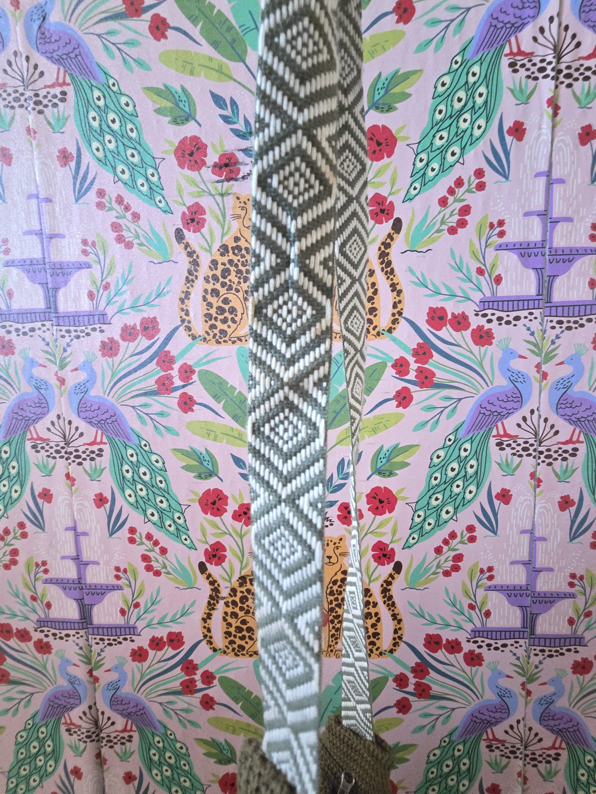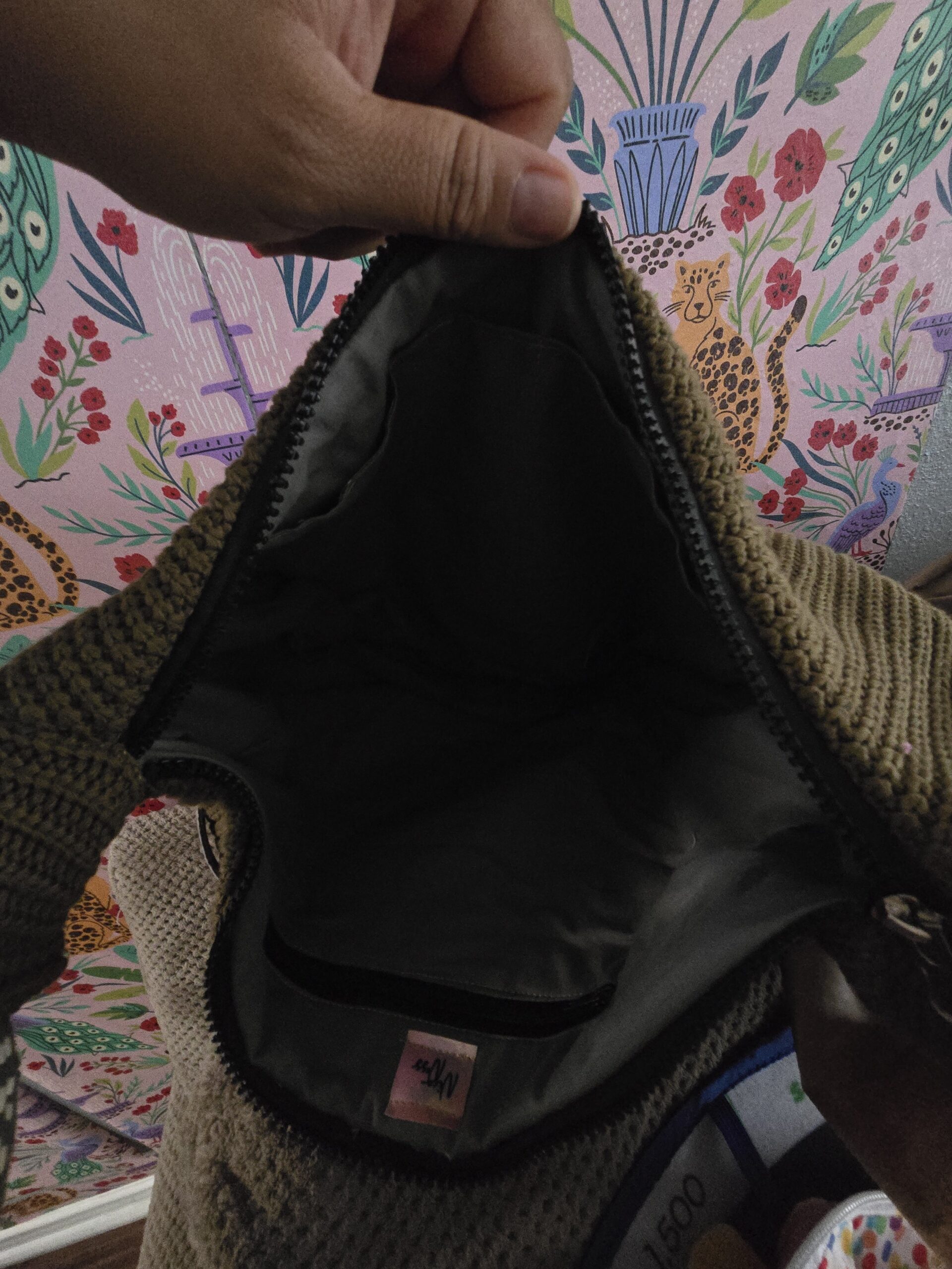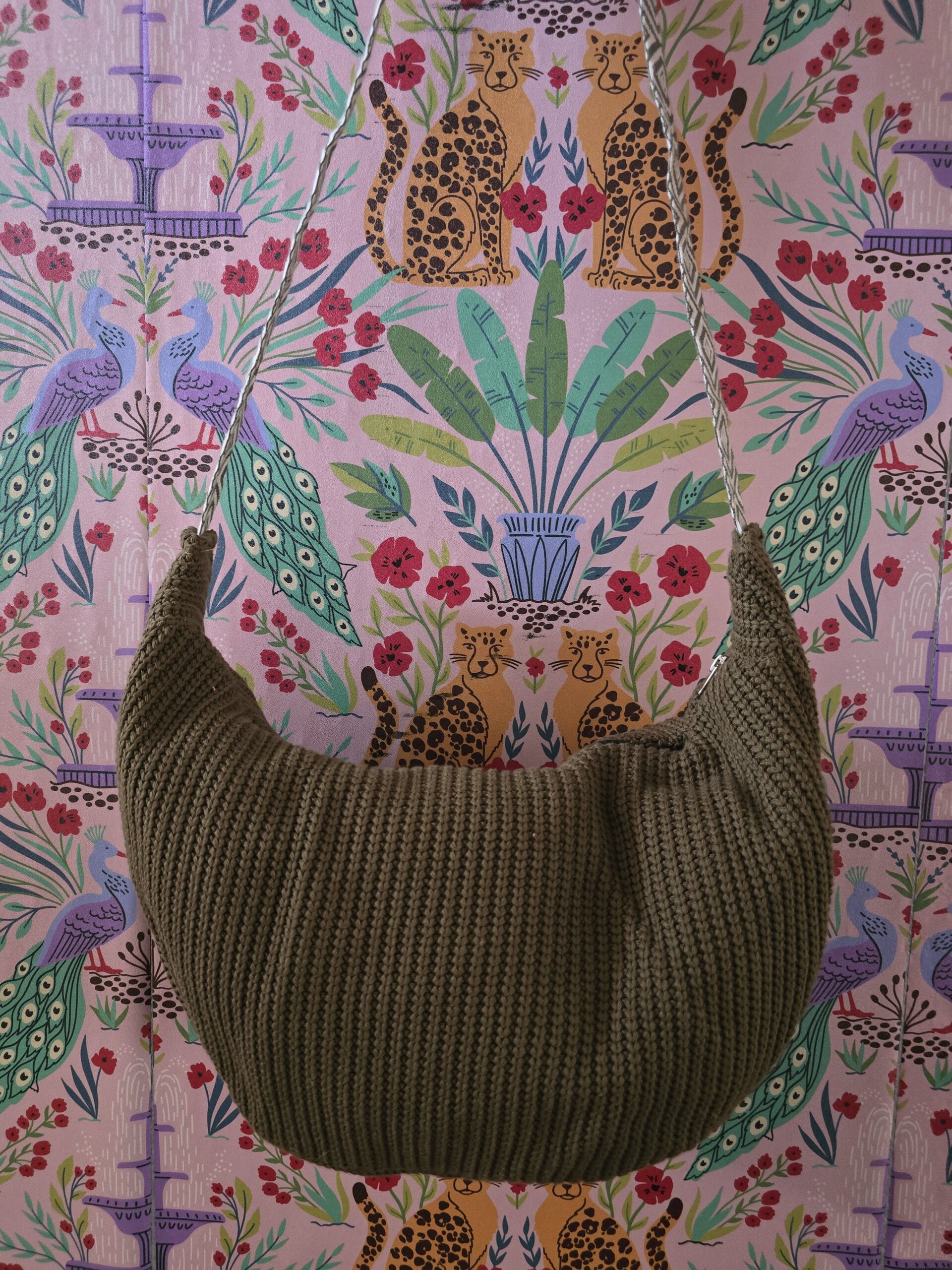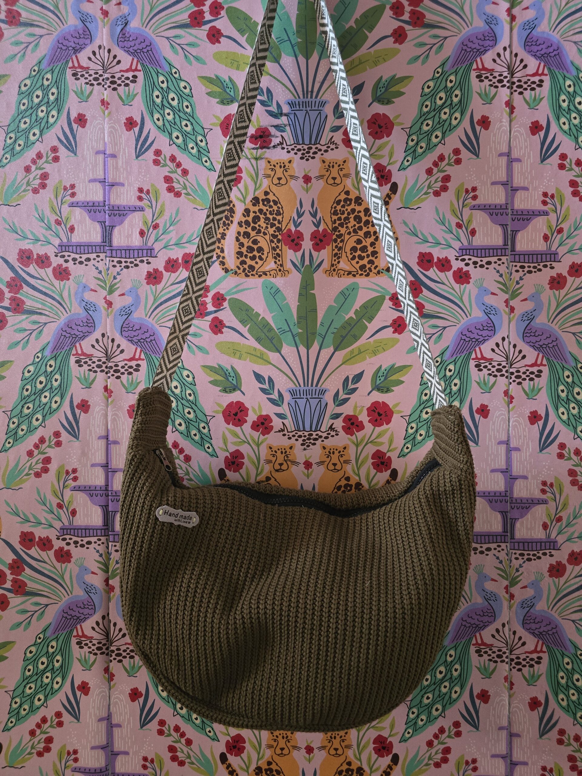 Hand-sewn banana bag. Two interior pockets, one with a zipper. Size: H: 9inches, L: 16 inches, W: 3.5 inches